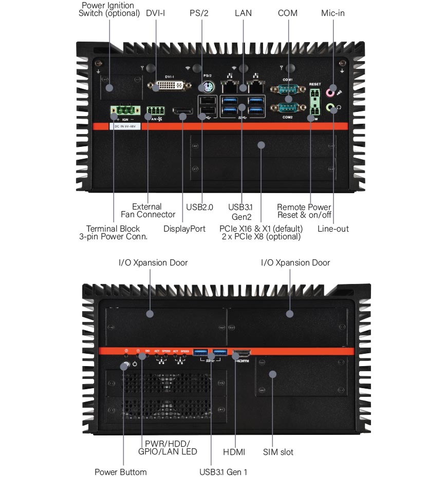 REAR I/O 1 x DisplayPort 1.2 / 1 x DVI-I / 2 x RJ-45 / 4 x USB 3.1 Gen 2 (10 Gbps) / 2 x USB 2.0 / 2 x RS232 / 422 / 485 (Support Power 5V / 12V) / 1 x Mic-in / 1 x Line-out / 1 x 2-pin Terminal Block Remote Power Reset / 1 x 3-pin Terminal Block Power Input / 1 x 4-pin Terminal Block External Fan Connector / 1 x 2-pin Terminal Block Remote Power on / off / 4 x SMA Antenna (Optional for WiFi/LTE function)